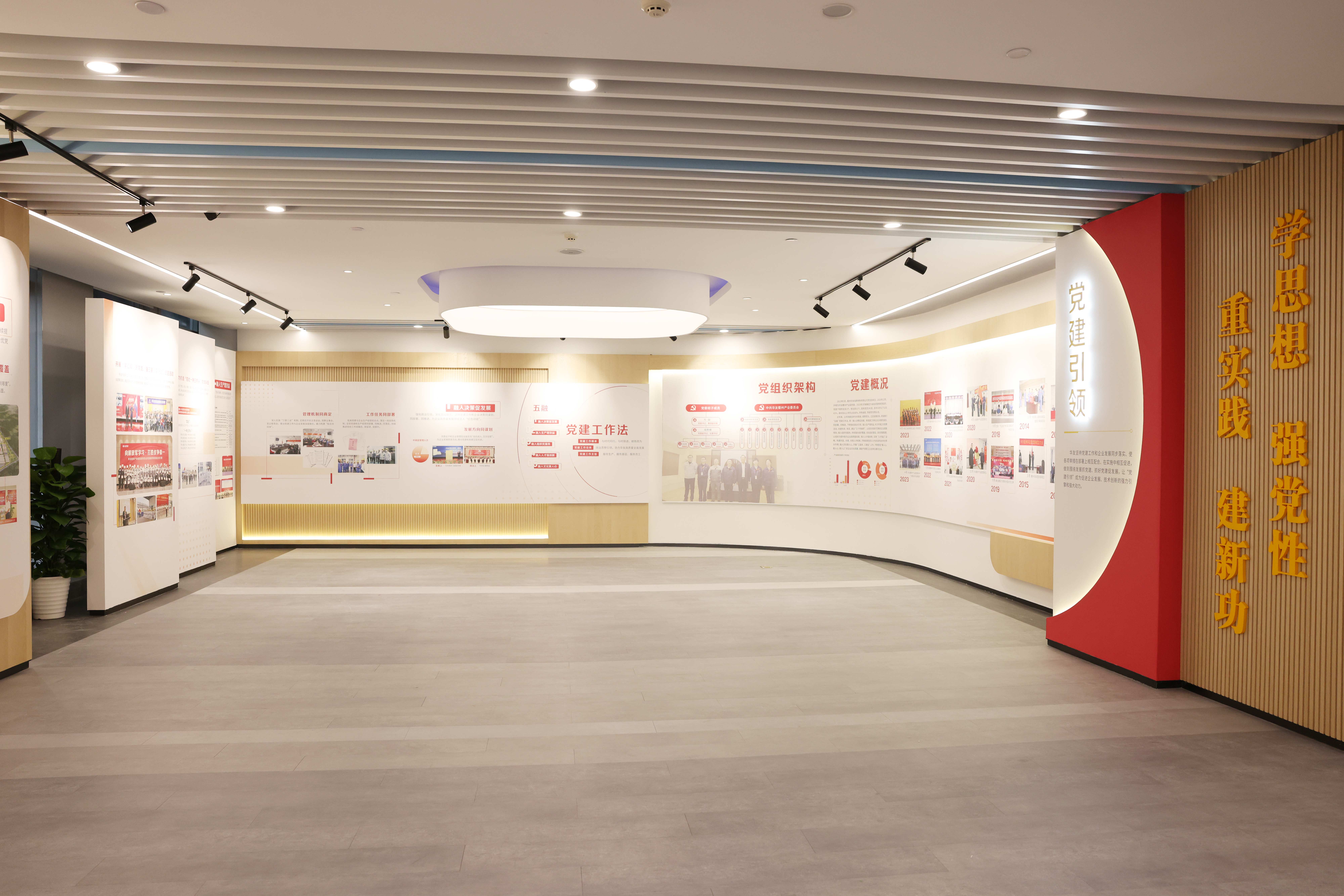 華友衢州產業園黨群服務中心形成“1+N”的功能布局,以黨群展示廳為主線,配有創業發展史展廳、職工書屋、紅色教育中心、新聞直播間、“兩代表一委員”工作室等區塊,是集教育宣傳、接待辦事、會議培訓、文化衛建等功能的開放式職工文化綜合性黨群服務陣地,實現紅色元素可觀可感,形成一道亮麗的“紅色風景線”。