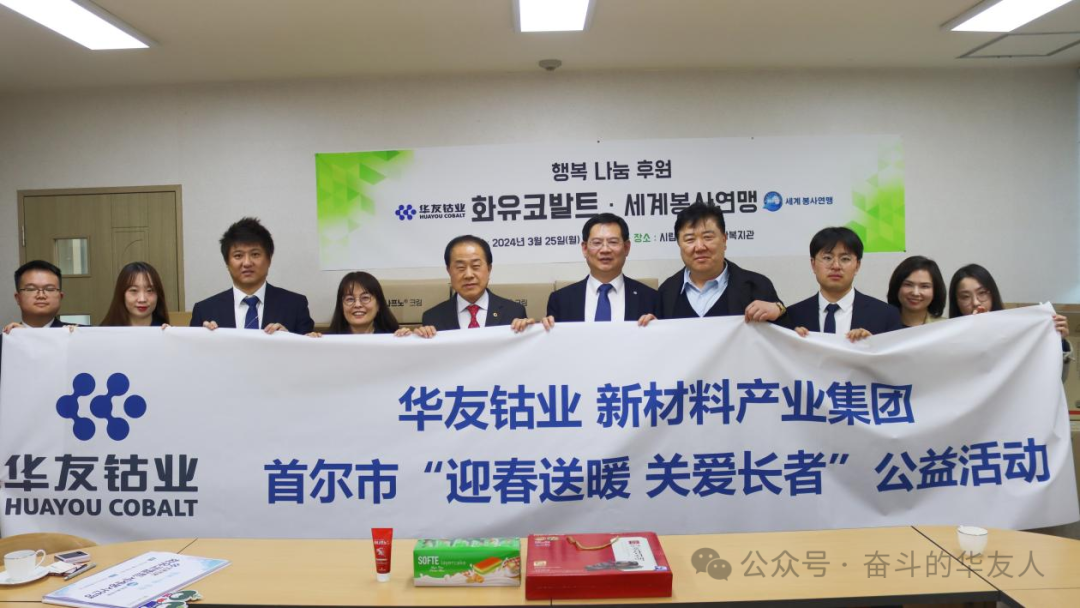 On 25th March, the Korea Representative Office of Huayou Cobalt New Material Industry Group, together with the Seoul City Council Member Kim Yong-ho and the President of the World Public Welfare Alliance Hong Jinyu, went to the Yongsan Elderly Comprehensive Welfare Hall in Seoul, Korea, to carry out the public welfare activity of "Sending warmth to the elderly in the spring, caring for the elderly", and to send warmth and care for the elders.