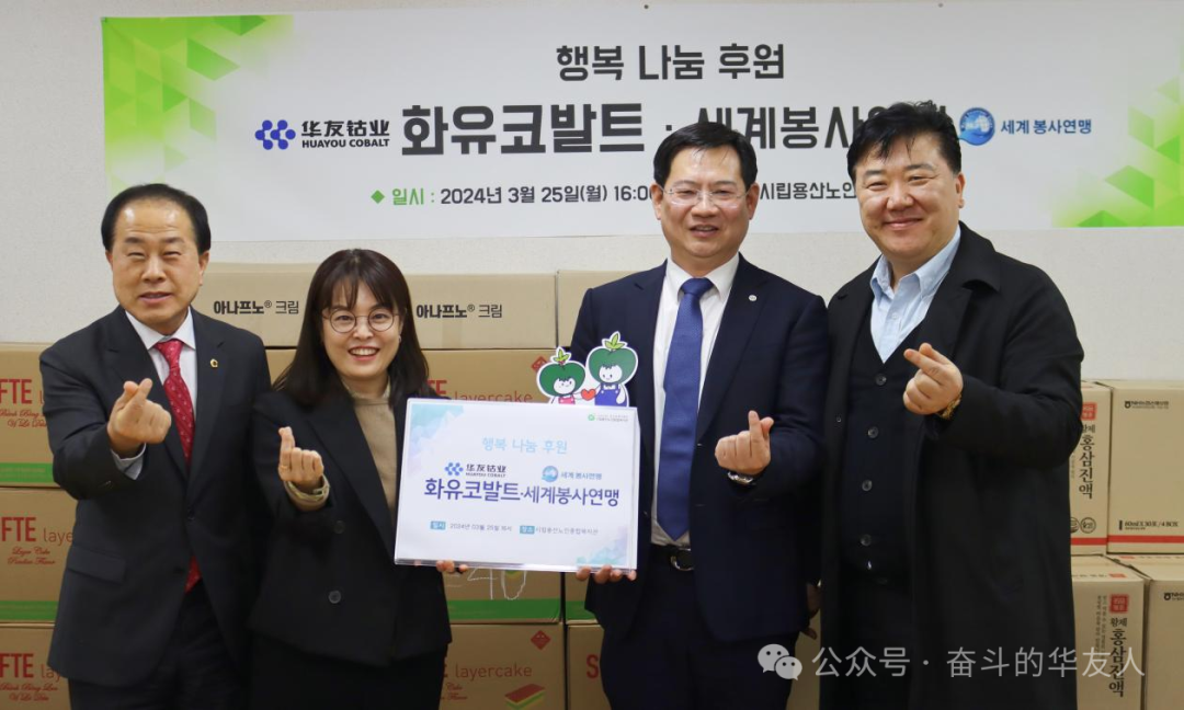 ▲In March 2024, the Korea Representative Office of Huayou Cobalt New Material Industry Group donated food, medicines, healthcare products and other items needed by the elderly in their daily lives to the Yongsan Elderly Comprehensive Welfare Hall in Seoul, South Korea.