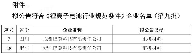Recently, the Ministry of Industry and Information Technology (MIIT) of the national government announced the ninth batch of enterprises conforming to the "Lithium-Ion Battery Industry Normative Conditions." A total of 36 enterprises nationwide were selected, and both Chengdu Bamo Technology Co., Ltd. and Zhejiang Bamo Technology Co., Ltd., under Huayou New Energy Industry Group, were simultaneously selected. Previously, Tianjin Bamo Technology Co., Ltd. was already selected in the first batch of the normative conditions in 2016, marking the industry group's national-level recognition for standardized development and comprehensive strength in the lithium battery industry.