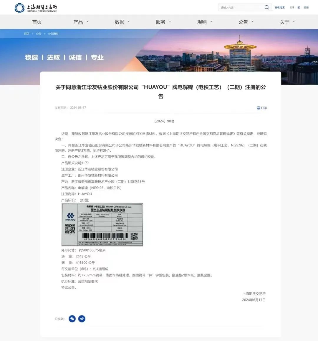 6月17日,華友鈷業(yè)子公司衢州華友鈷新材料有限公司生產(chǎn)的“HUAYOU”牌電解鎳(電積工藝,Ni99.96)(二期)成功注冊為上海期貨交易所(以下簡稱“上期所”)鎳期貨標(biāo)準(zhǔn)合約交割品牌,注冊產(chǎn)能為3萬噸。2023年6月,“HUAYOU”牌電解鎳(一期)注冊成功,注冊產(chǎn)能為6000噸,僅一年時間電解鎳交割數(shù)量提升5倍,將更大程度應(yīng)對市場流動性風(fēng)險,保障公司穩(wěn)健經(jīng)營。