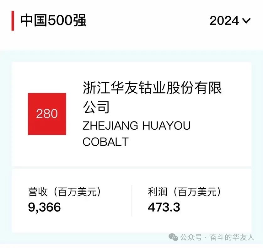 7月25日,2024年《財富》中國500強排行榜揭曉,華友鈷業以2023年93.66億美元的營收榮登該榜單,位列第280位。