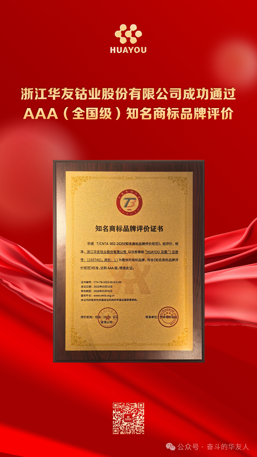 近日,華友注冊(cè)的“HUAYOU及圖”商標(biāo),經(jīng)標(biāo)品(北京)認(rèn)證有限公司現(xiàn)場(chǎng)評(píng)價(jià)、中華商標(biāo)協(xié)會(huì)知名商標(biāo)品牌工作委員會(huì)評(píng)審公示,被正式授予《知名商標(biāo)品牌評(píng)價(jià)規(guī)范》(T/CNTA002-2025)團(tuán)體標(biāo)準(zhǔn)升版以來(lái)首個(gè)AAA(全國(guó)級(jí))知名商標(biāo)品牌,也標(biāo)志著華友成為有色金屬行業(yè)首家通過(guò)AAA(全國(guó)級(jí))知名商標(biāo)品牌評(píng)價(jià)的企業(yè)。