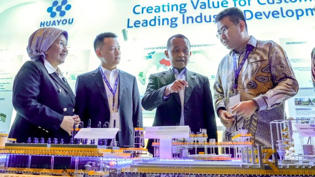展覽期間,華友展臺人氣持續高漲。來自不同背景的參觀者踴躍交流,尤其對華友在印尼建設的綠色智能制造設施表現出濃厚興趣。巴赫利爾部長還率多位高級政府官員蒞臨華友展位,與華友印尼高管團隊交流互動。他在現場所展現出的親切與熟悉,不僅體現了政府對企業的重視,更傳達出雙方之間良好的合作關系與深厚的信任基礎。
