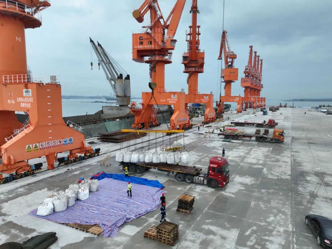 在玉林海港碼頭,工人們正有條不紊地進行緊張的裝卸作業(yè),裝車后分批運往華友廣西園區(qū)。本次鋰精礦的成功接卸,極大提升了華友廣西園區(qū)原料供應的自主性與穩(wěn)定性。相比原有路線,直接到貨玉林海港碼頭每次節(jié)省廣西華友原料運輸近100多公里陸運路程,有效降低了物流成本和運輸時間,顯著增強了園區(qū)的市場響應能力和產品綜合競爭力。這不僅是簡單的“少走彎路”,更是華友整合國內外物流資源、優(yōu)化全球布局的核心體現(xiàn)。