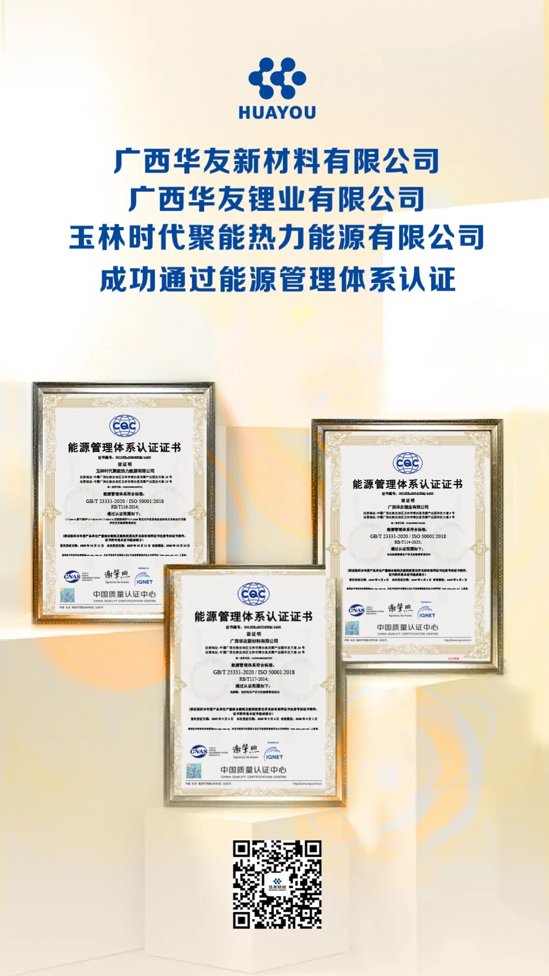 近日,華友鈷業(yè)下屬三家子公司傳來(lái)喜訊:廣西華友新材料有限公司、廣西華友鋰業(yè)有限公司及玉林時(shí)代聚能熱力能源有限公司,成功通過(guò)ISO50001能源管理體系認(rèn)證。