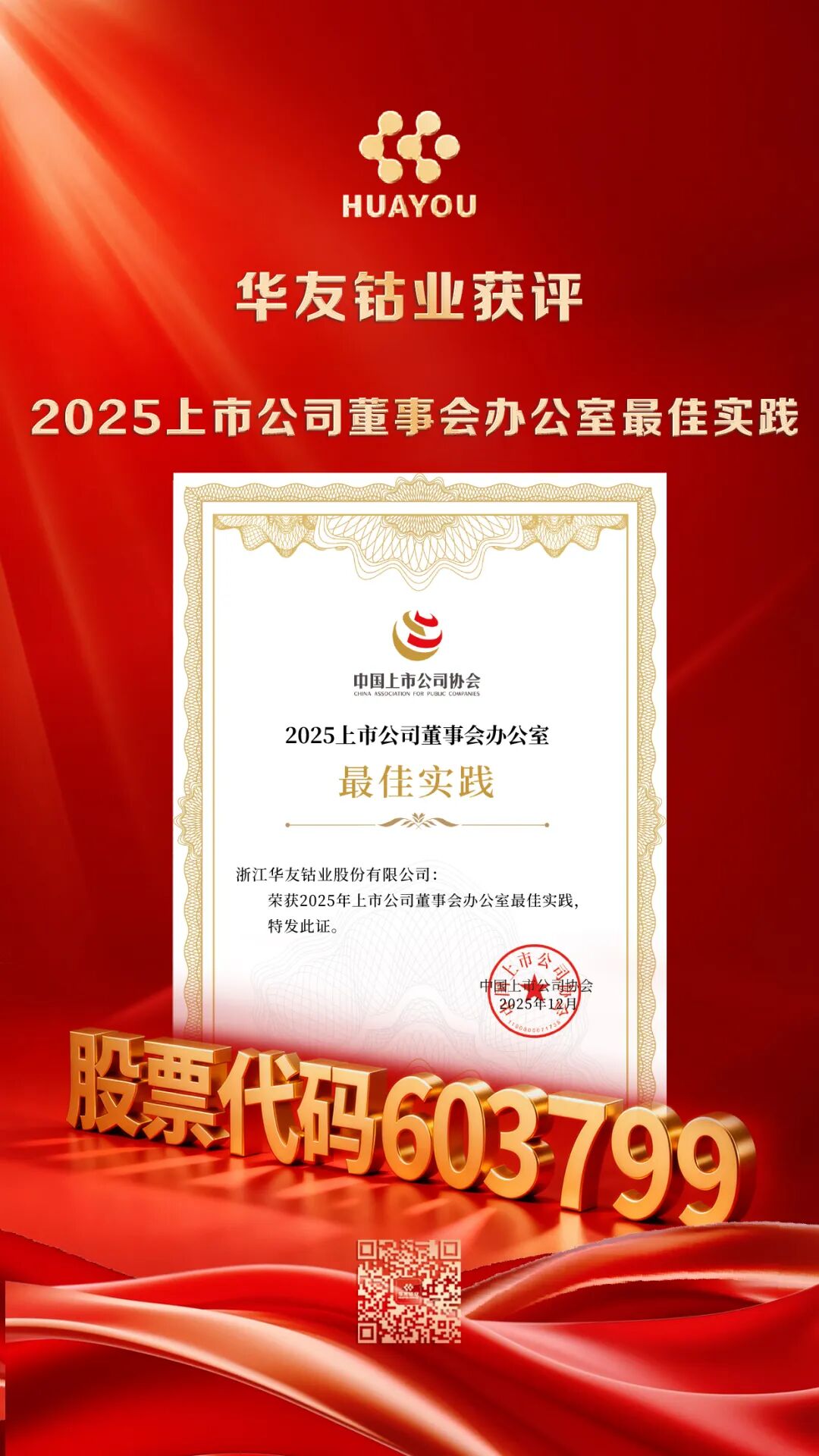 中國上市公司協會發布 “2025上市公司董事會辦公室最佳實踐”評選結果,公司成功入選該權威榜單。該獎項關注董事會辦公室在戰略支持、合規運營、治理協調與執行保障等方面的作用,彰顯了公司在治理機制建設與運作方面的系統化、專業化水平。