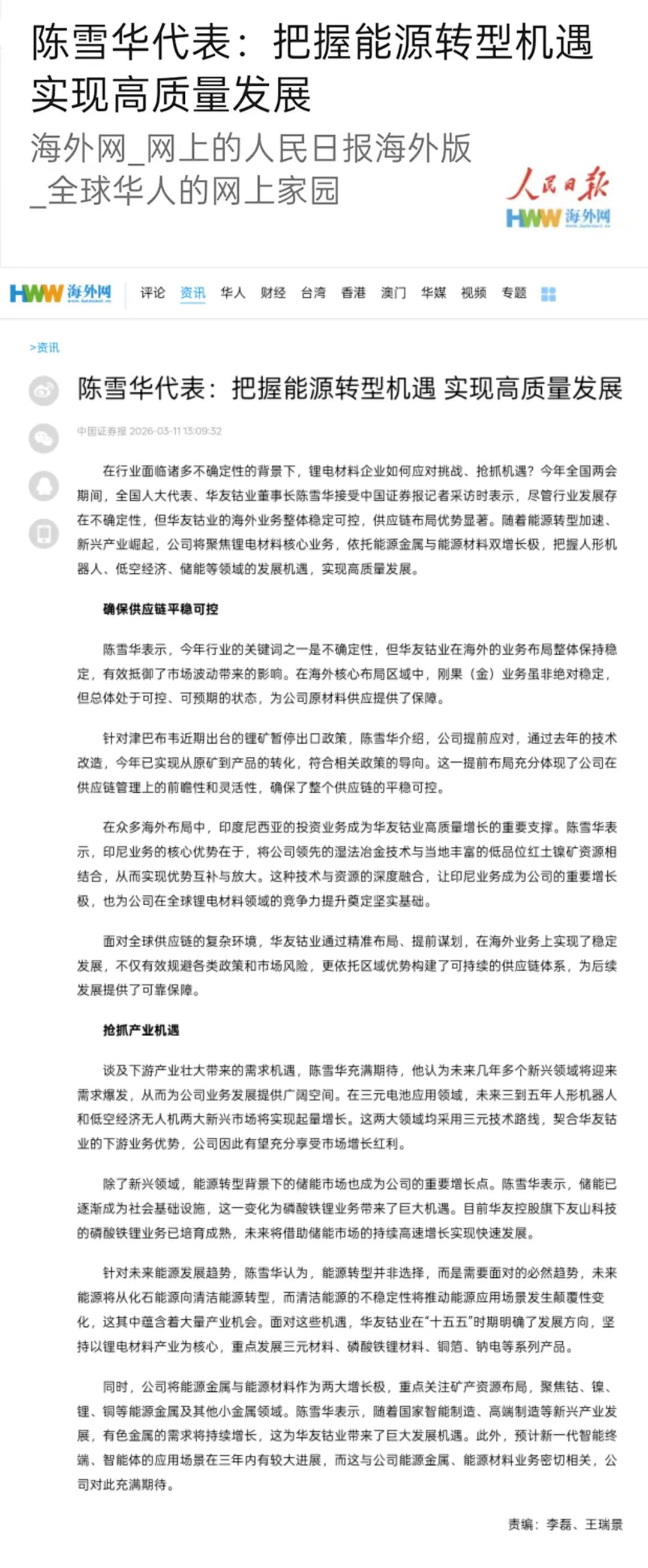 3月11日,《人民日報》海外網發(fā)布《陳雪華代表:把握能源轉型機遇 實現(xiàn)高質量發(fā)展》一文。