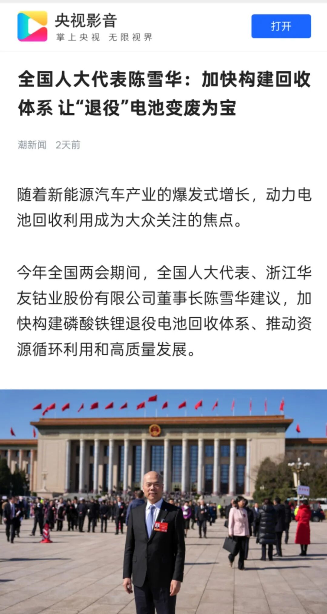 3月10日,央視影音發(fā)布《全國人大代表陳雪華:加快構建回收體系 讓“退役”電池變廢為寶》一文。