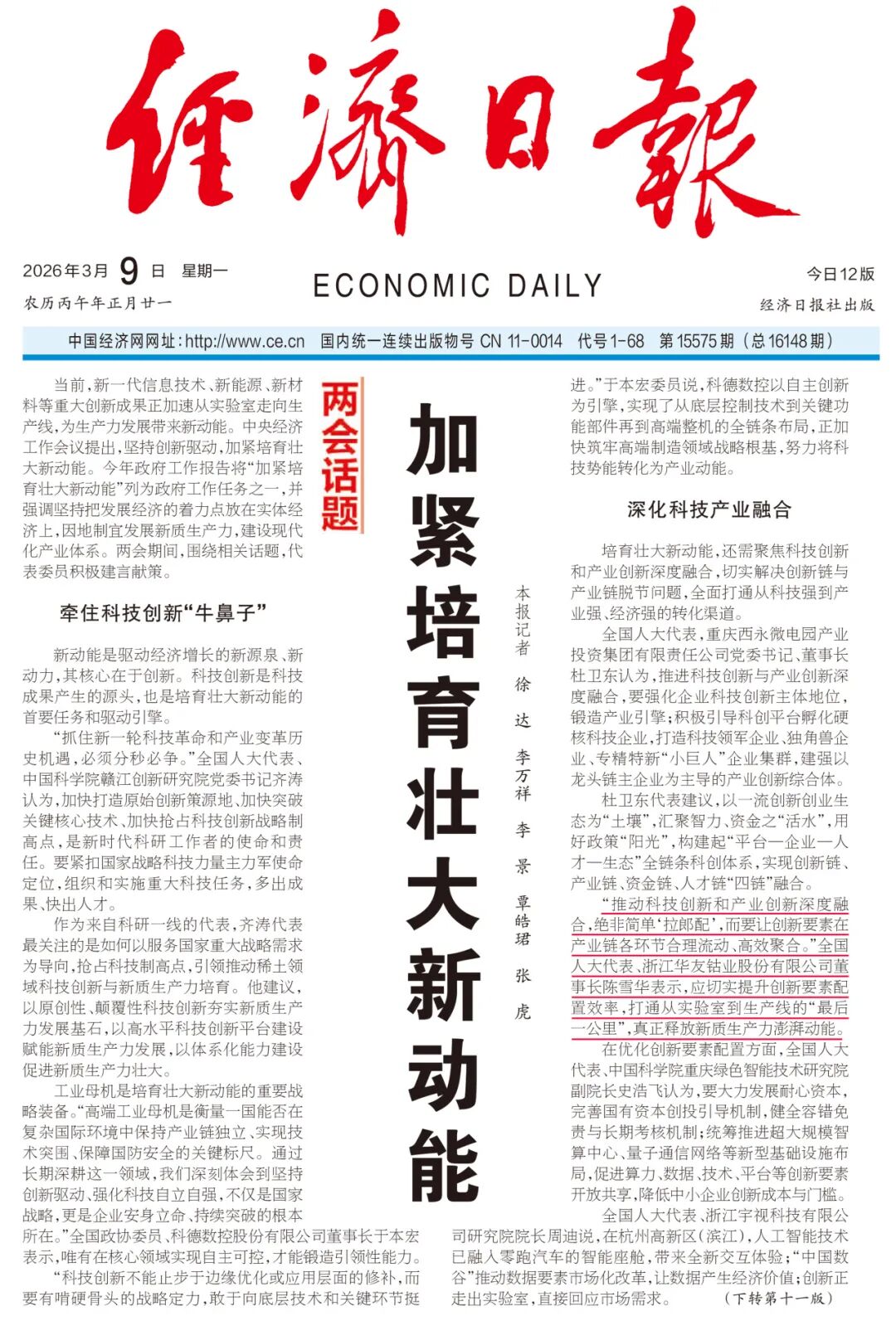 3月9日,《經濟日報》頭版頭條報道兩會期間,圍繞新質生產力相關話題,代表委員積極建言獻策。報道中,陳雪華代表表示,應推動科技創(chuàng)新和產業(yè)創(chuàng)新深度融合,切實提升創(chuàng)新要素配置效率,打通從實驗室到生產線的 “最后一公里”,真正釋放新質生產力澎湃動能。