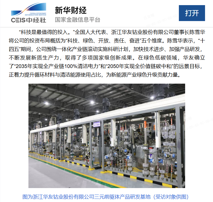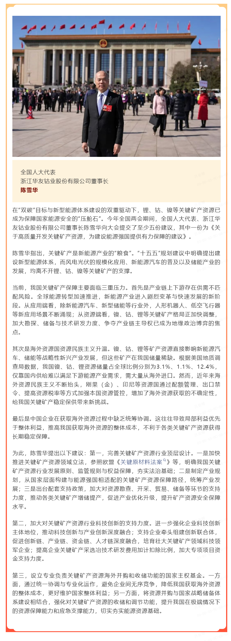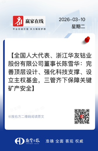 3月10日,期貨日報網刊發(fā)專題報道 ——《全國人大代表、浙江華友鈷業(yè)股份有限公司董事長陳雪華:完善頂層設計、強化科技支撐、設立主權基金,三管齊下保障關鍵礦產安全》。
