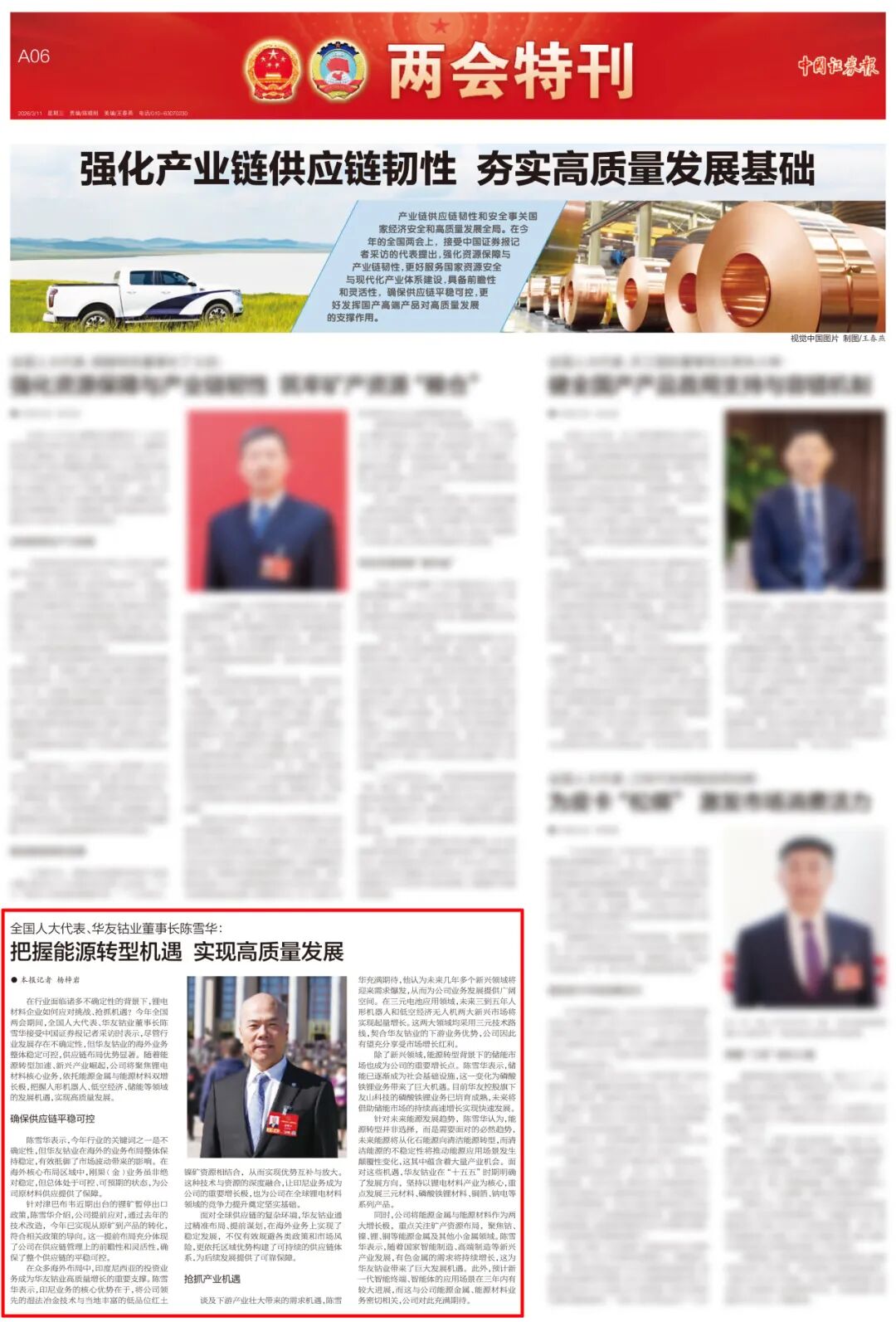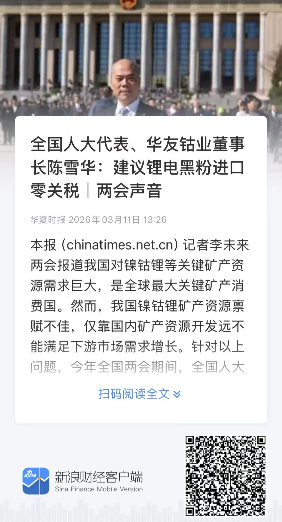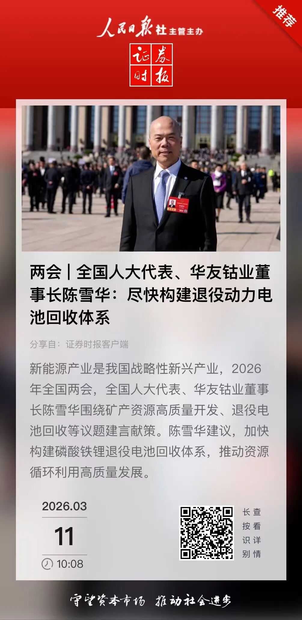 3 月 11 日,《華夏時報》刊發(fā)《全國人大代表、華友鈷業(yè)董事長陳雪華:建議鋰離子電池用再生黑粉進口零關稅|兩會聲音》報道。