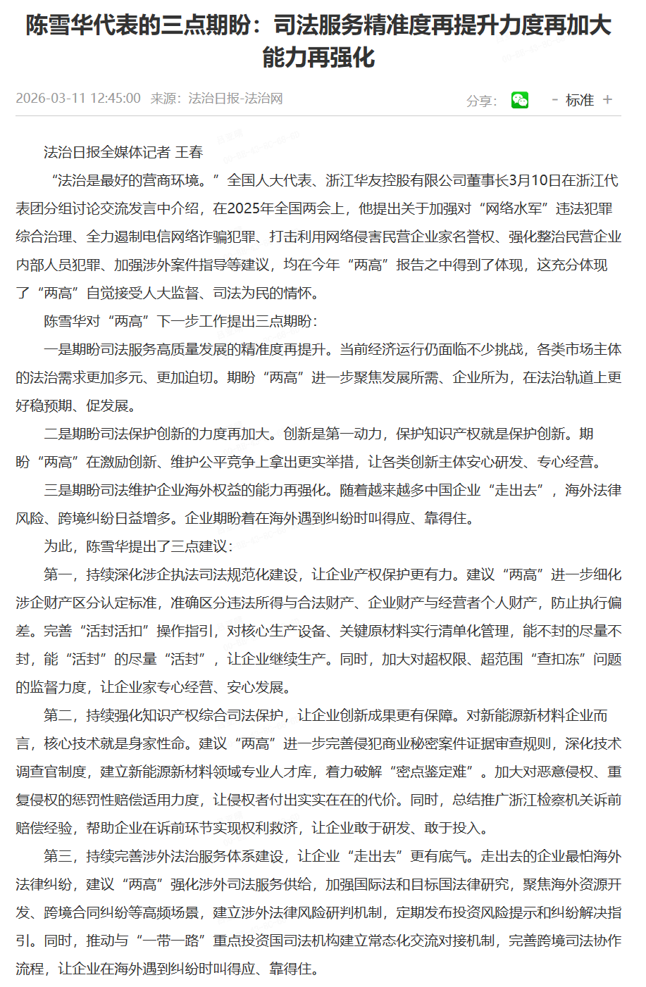 3月11日,法治網刊發(fā)專題報道 ——《陳雪華代表的三點期盼:司法服務精準度再提升 力度再加大 能力再強化》。