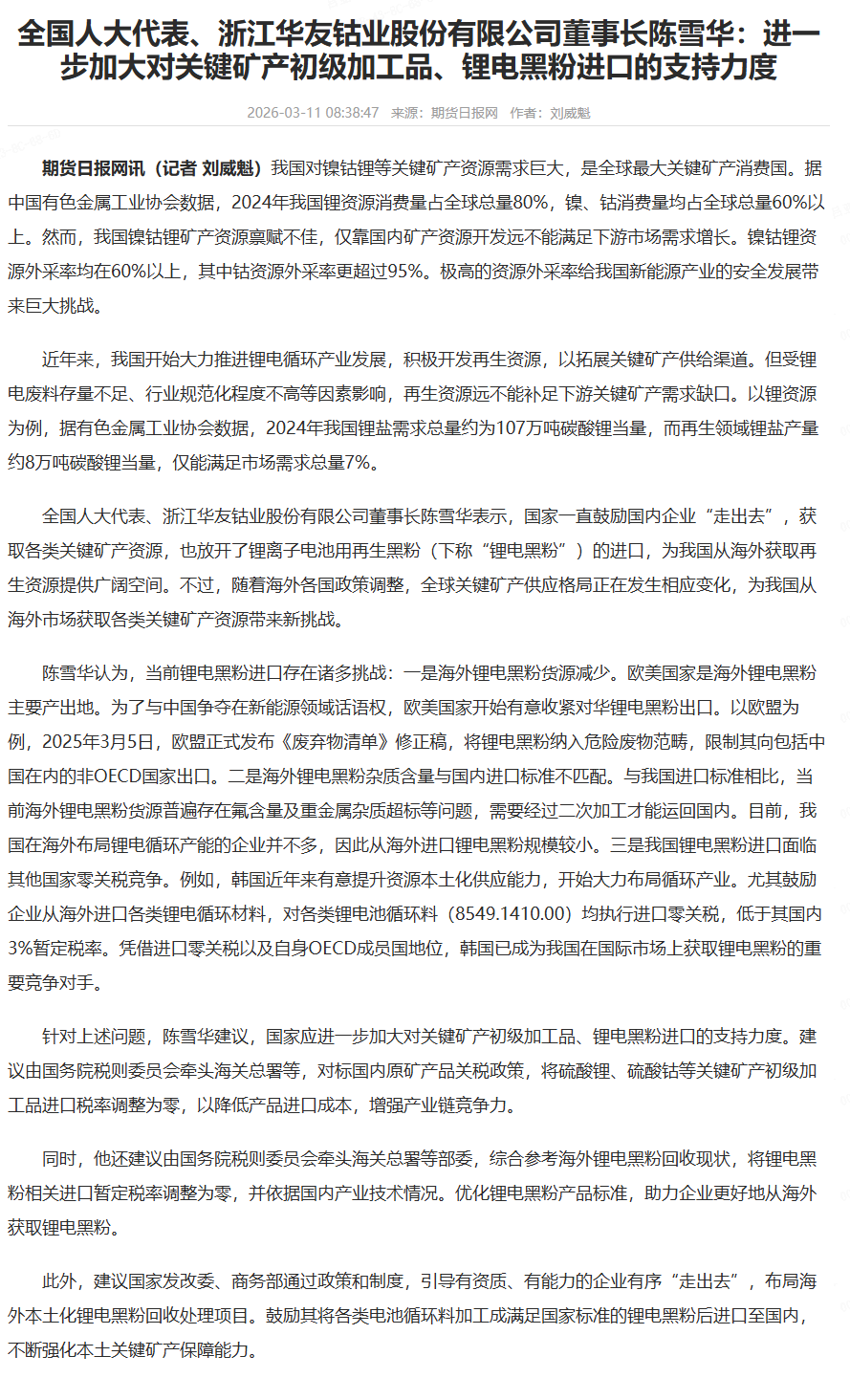 3月11日,期貨日報網刊發(fā)專題報道 ——《全國人大代表、浙江華友鈷業(yè)股份有限公司董事長陳雪華:進一步加大對關鍵礦產初級加工品、鋰電黑粉進口的支持力度》。