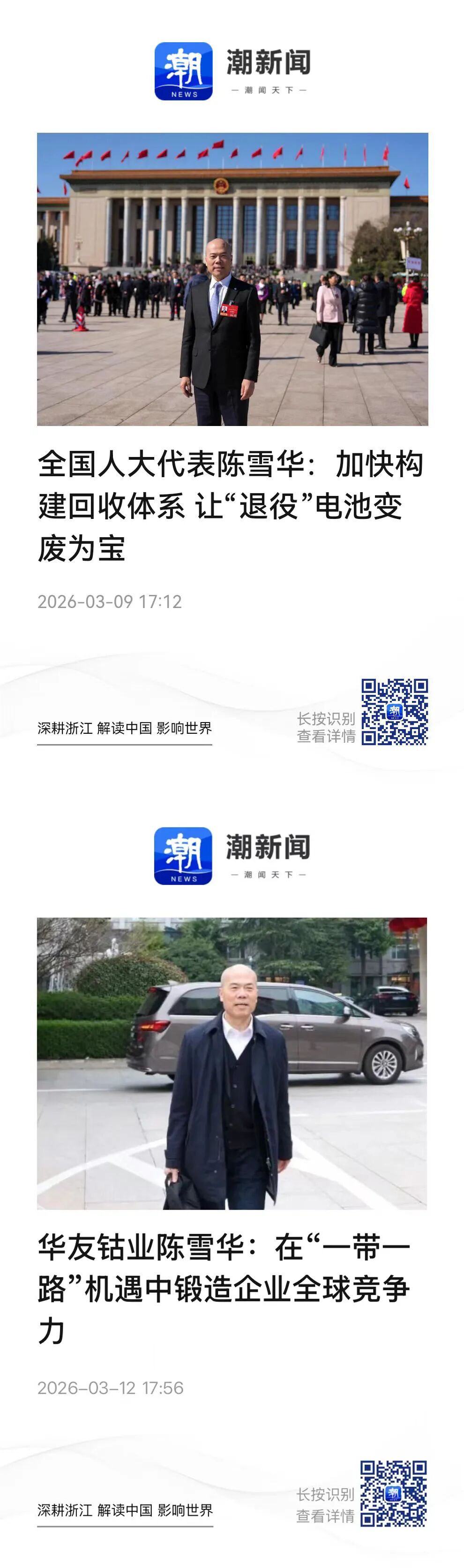 3月9日,浙江日報報業(yè)集團潮新聞平臺以專題形式報道陳雪華代表履職聲音。報道聚焦新能源產業(yè)高質量發(fā)展,重點呈現(xiàn)陳雪華代表關于加快構建動力電池回收體系、推動退役電池資源化循環(huán)利用、讓 “退役” 電池變廢為寶的建議與思考。