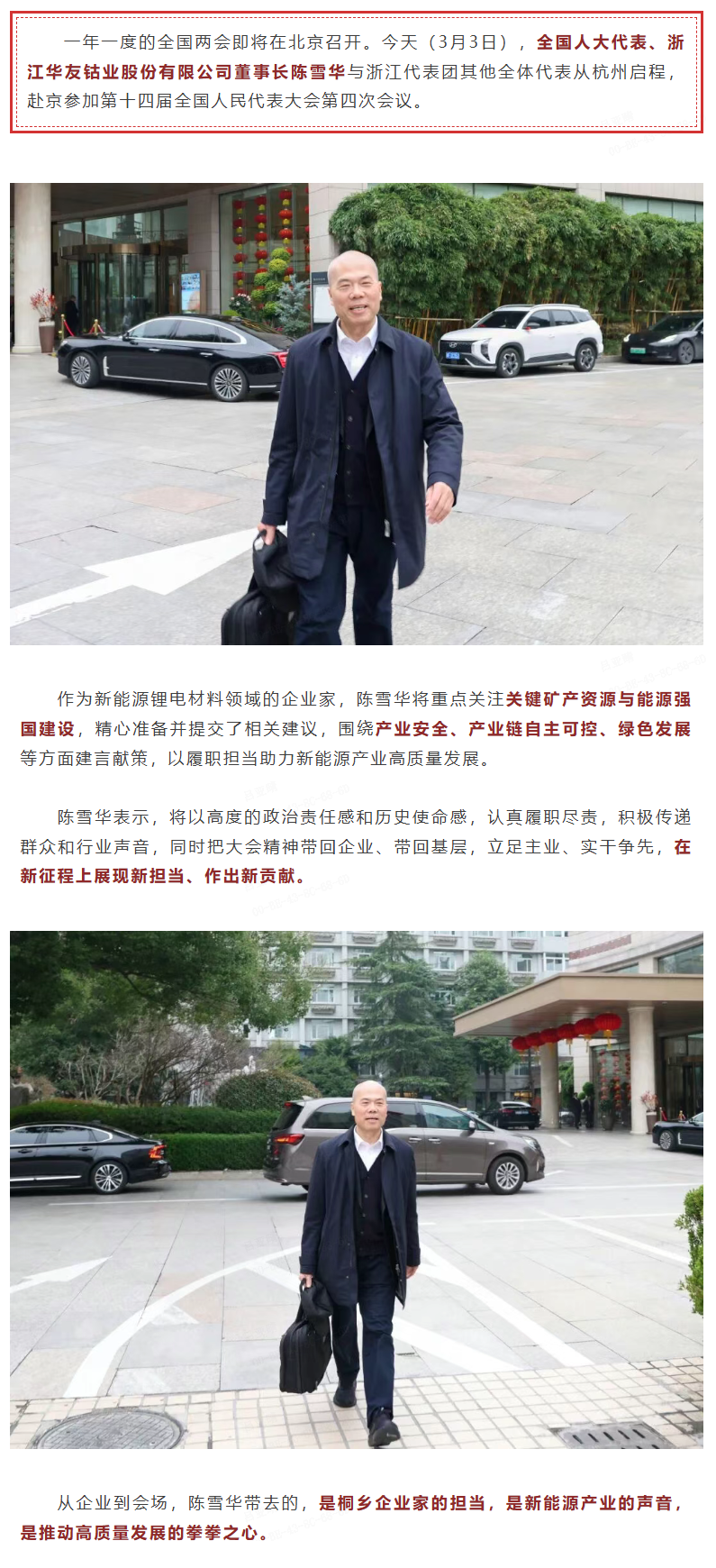 3月3日,陳雪華代表啟程參加全國兩會,桐鄉(xiāng)發(fā)布刊發(fā)《今天啟程!全國人大代表陳雪華赴京參會》的文章。