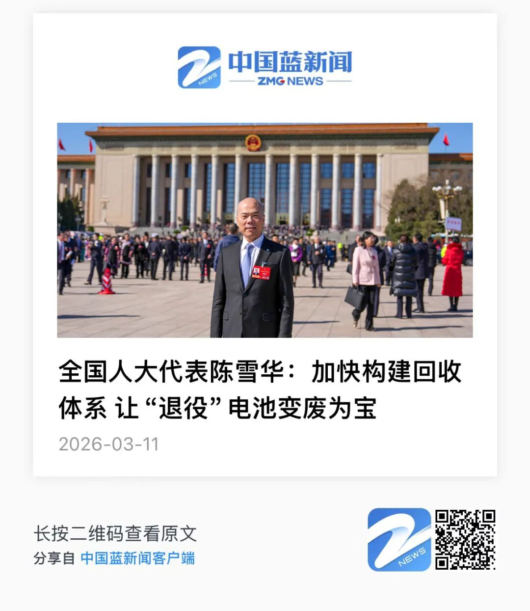3月11日,中國藍新聞雜志刊發(fā)《全國人大代表陳雪華:加快構建回收體系 讓“退役”電池變廢為寶》一文。